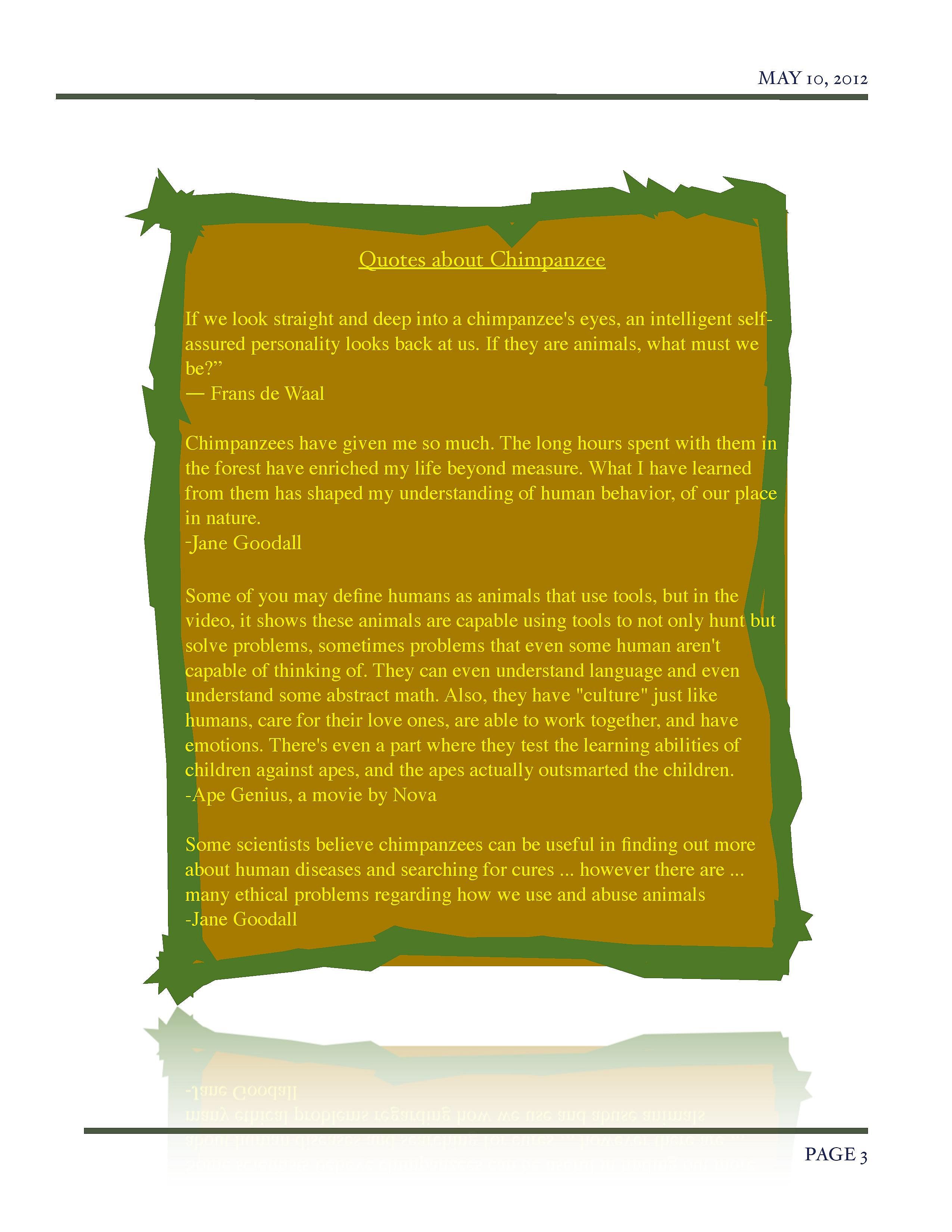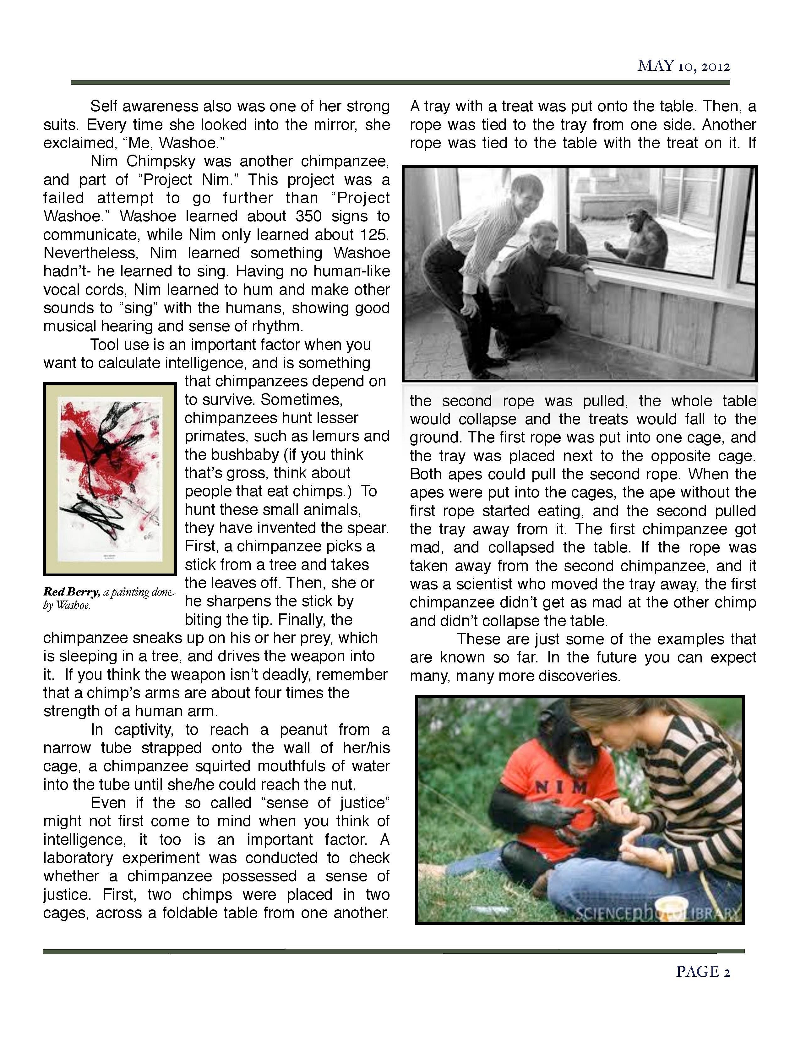 This newspaper features the intelligent attributes of the chimpanzee as reported and published by Mountain Elementary School 6th grade student Lena Vinogradova.