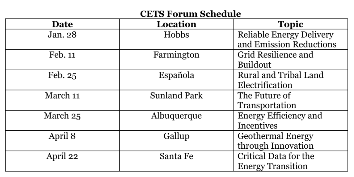 The seven forums will be held at various locations across the state. Each individual forum will focus on how that specific region can contribute to, and benefit from, New Mexico’s transition a clean energy economy. The first forum is scheduled for Jan. 28 from 9 a.m. to noon at New Mexico Junior College in Hobbs.