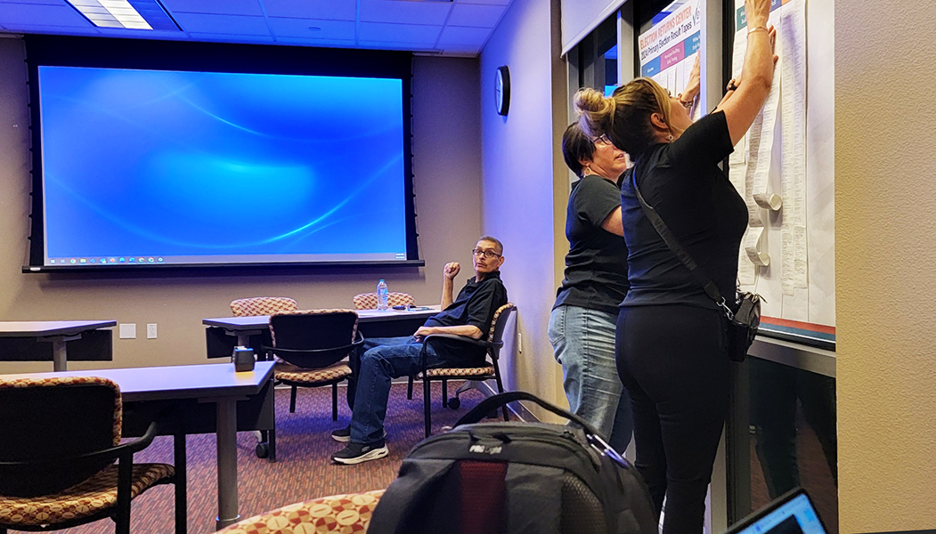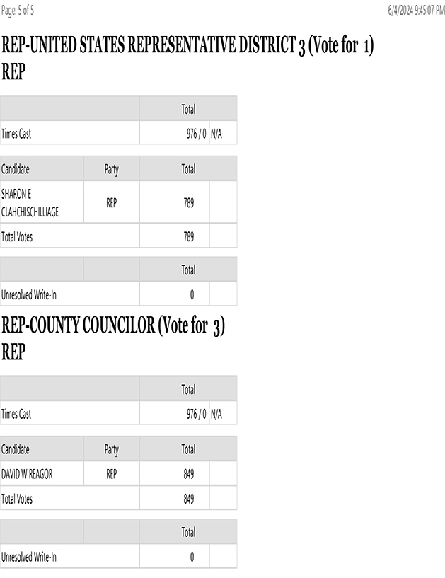 Los Alamos County Clerk Naomi Maestas, right, and Deputy Clerk Allison Collins post the final unofficial 2024 Primary Election totals tonight in the Boards and Commissions Room at the Municipal Building. Photo by Carol A. Clark/ladailypost.com