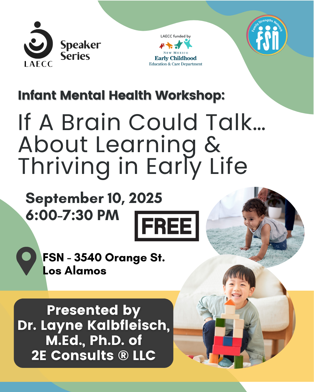 Los Alamos Early Childhood Collaboration (LAECC) Speaker Series: Infant Mental Health – “If A Brain Could Talk About Learning & Thriving in Early Life”, 6-7:30 p.m., Wednesday, Sept. 10, 2025, at Family Strengths Network in Los Alamos. Cost is free.