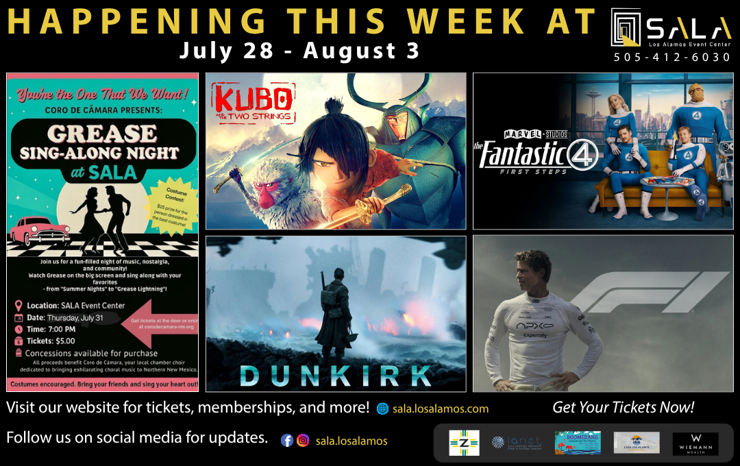 SALA Los Alamos Event Center continues to be the hub for film, community, and culture with a dynamic schedule from July 28 to Aug. 3, featuring a sing-along event, new releases, family screenings, and timeless classics.