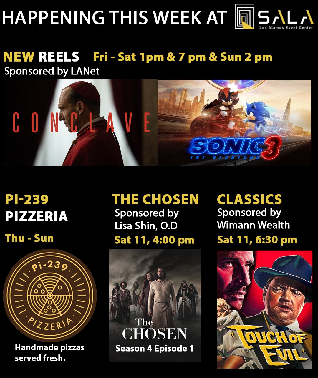 SALA Event Center invites movie enthusiasts and families to another exciting week of captivating films, thrilling premieres, and heartwarming classics. With something for everyone, SALA continues to be the premier destination for entertainment in Los Alamos.