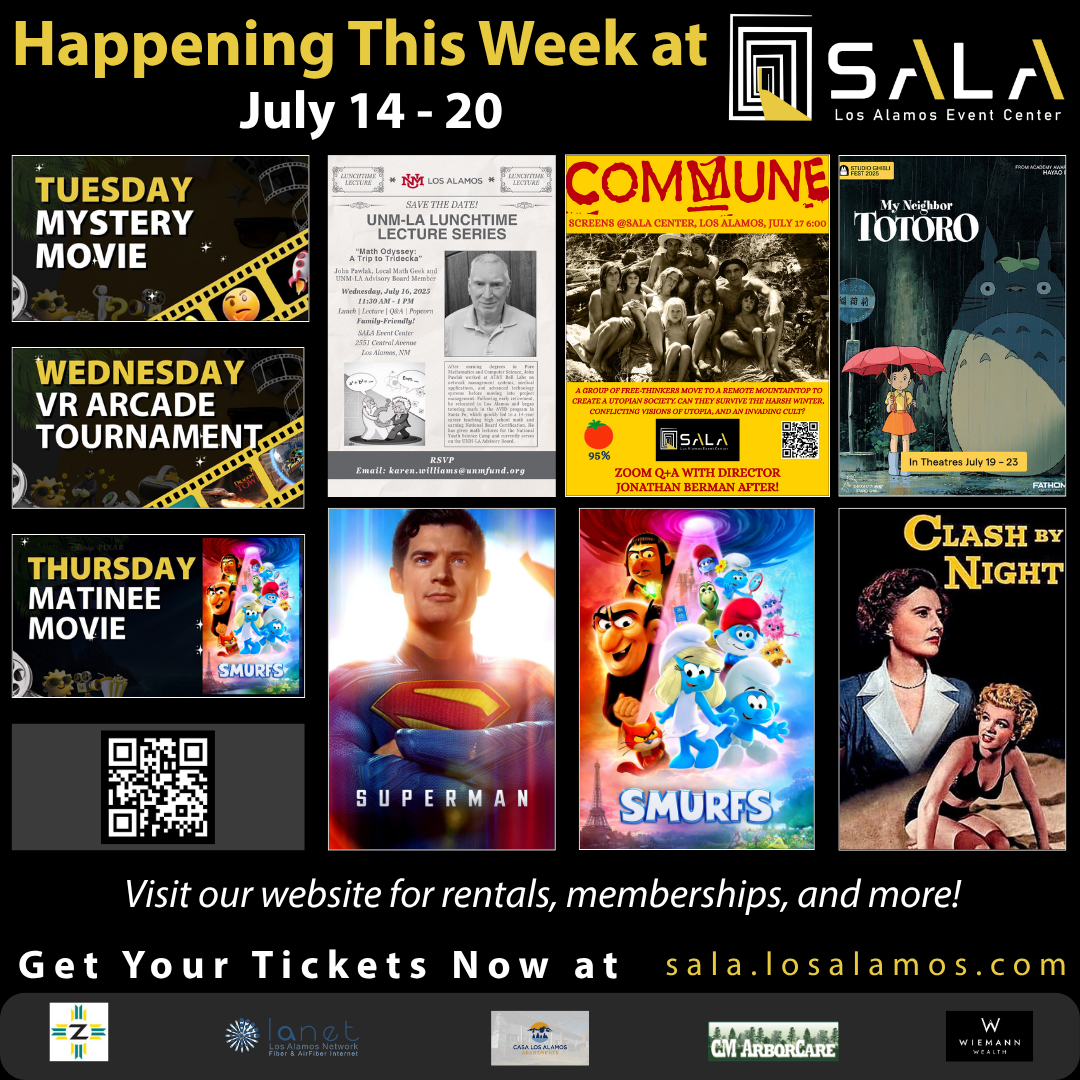 SALA Los Alamos Event Center invites the community to a vibrant week of films, lectures, and immersive experiences from July 14 to 20. With a lineup that includes a new superhero release, nostalgic animation, intellectual discussion, and award-winning cinema, there’s something for everyone at SALA.