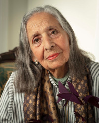 Born in the Venezuelan coastal city of Maiquetía Nov. 28, 1920, Luchita Hurtado came to the United States at the age of eight and spent her formative years in New York living with her mother, siblings, aunts, and cousins. Her mother worked as a seamstress, perhaps influencing Hurtado, who designed her own clothing throughout her life. Hurtado commuted for two hours each day to attend an all-girls art high school so she could study art and theatre. She went on to take classes at the New York Art Students League. A lifelong traveler, Hurtado lived in the Dominican Republic, Mexico City, Rome, and Chile, as well as in the U.S. cities of New York, Mill Valley, and Santa Monica. In the 1970s, after visiting Taos for many years, she and her family bought land and built a house in the nearby village of Arroyo Seco.