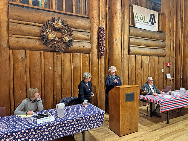From left, Rep. Christine Chandler, moderator Margo Batha, League of Women Voters of Los Alamos First Vice President Leslie Wallstrom and Sen. Leo Jaramillo participate in the 2026 Legislative Preview Thursday evening at Fuller Lodge. Photo by Kirsten Laskey/ladailypost.com