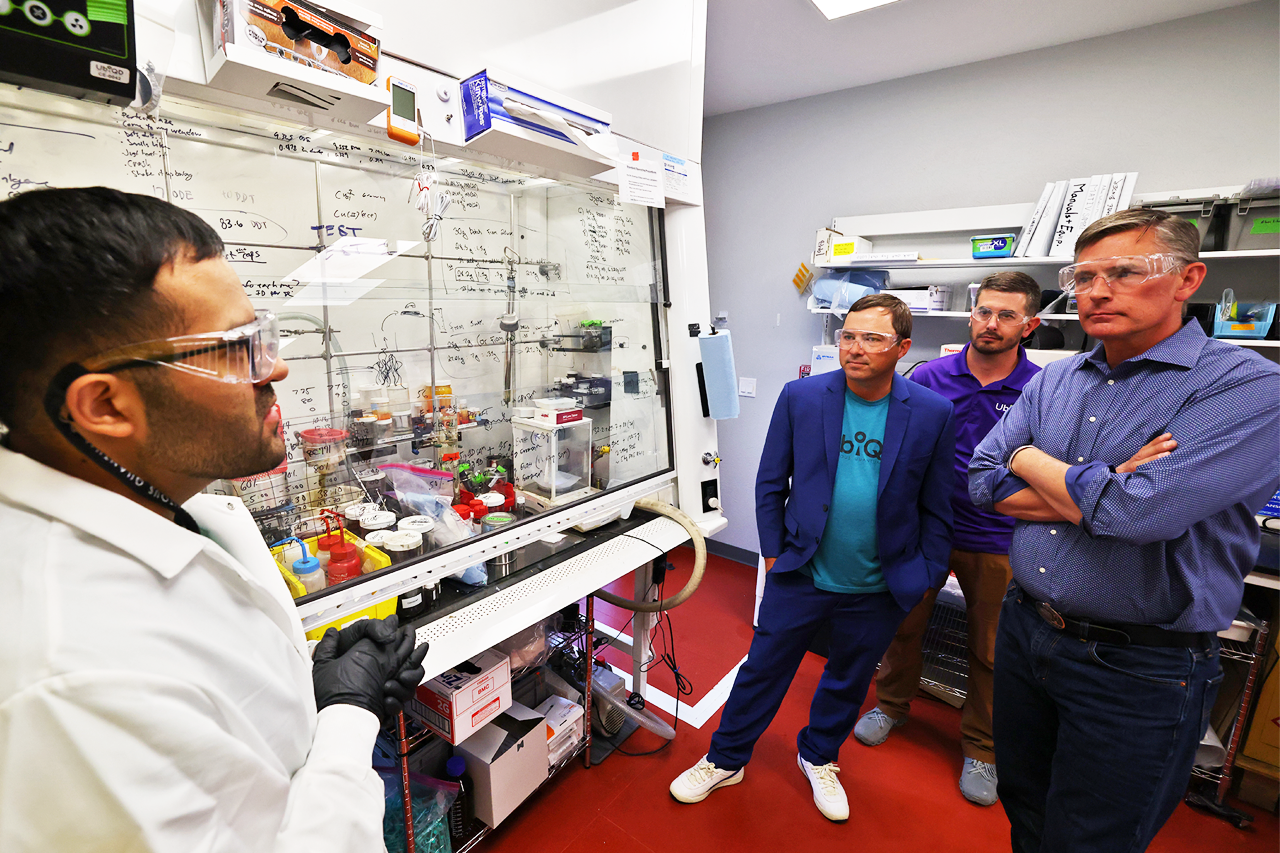 U.S. Sen. Martin Heinrich, second from left, with UbiQD Founder/CEO Hunter McDaniel speaks with scientists during his tour Wednesday at UbiQD. Photo by John McHale/ladailypost.com