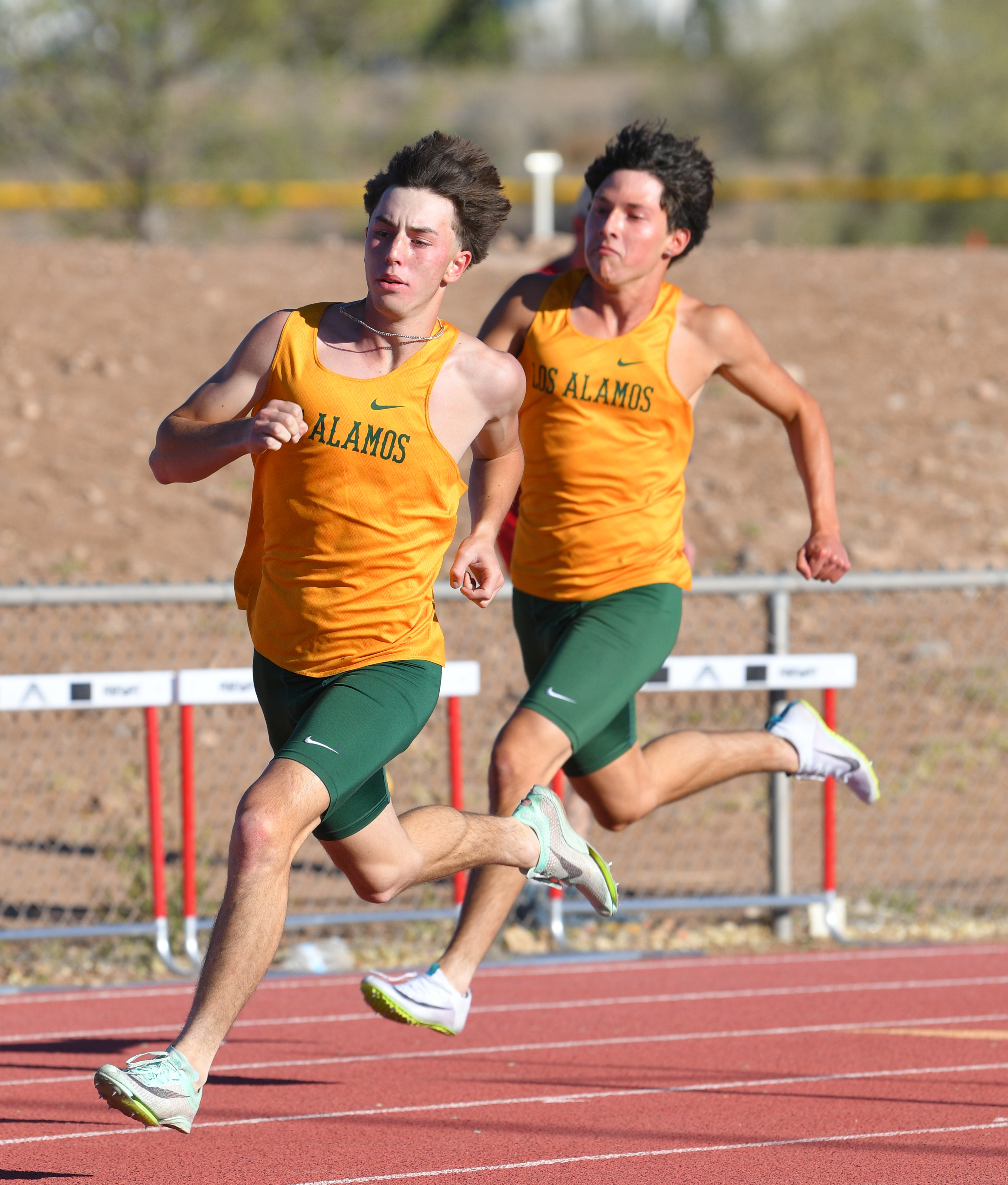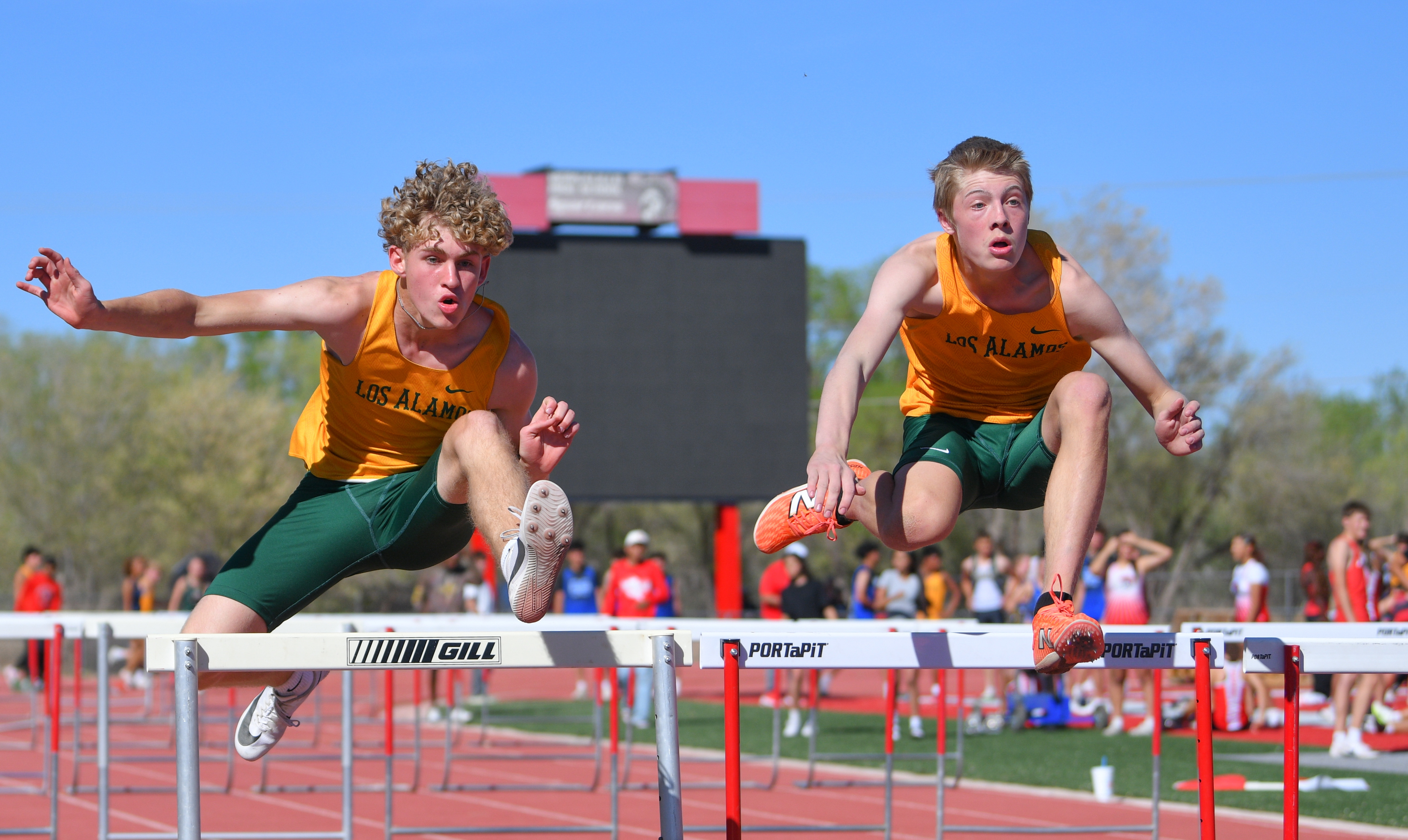 Tyven Beaux, right, and Colton Berg finished 3rd and 5th, respectively, in the 110m hurdles at Bernalillo. Photo by Blake Wood