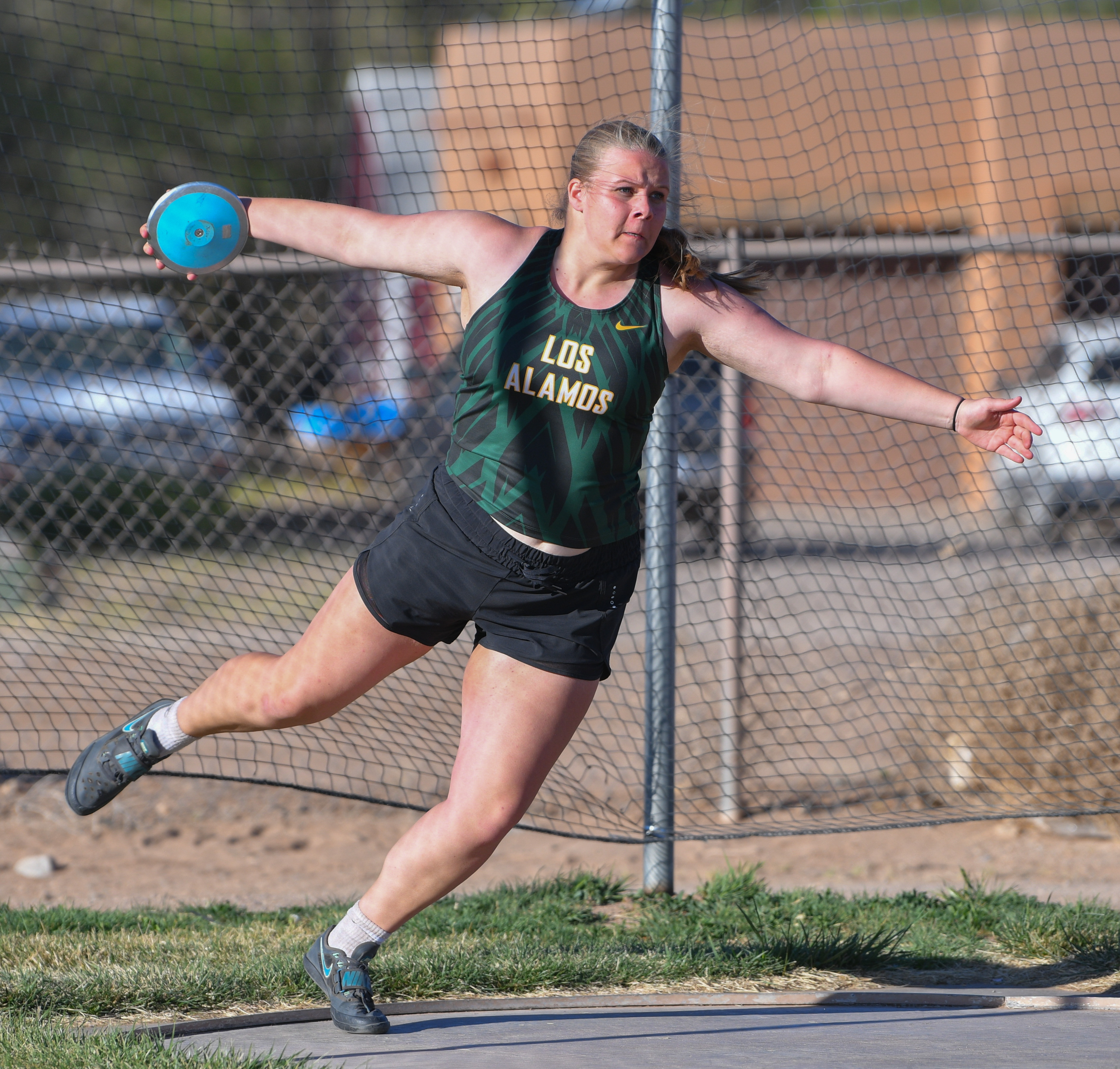 Sarah Martis won the discus at Bernalillo with a state qualifying throw of 112’1″. Photo by Blake Wood