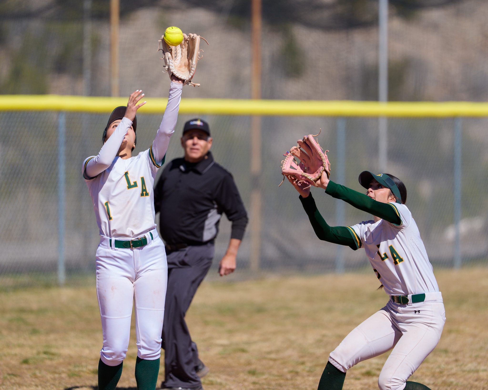 Sierra Gonzales catches a pop fly at 3rd base with Abagail DeHerrera backing her up. Photo by Nate Limback/ladailypost.com