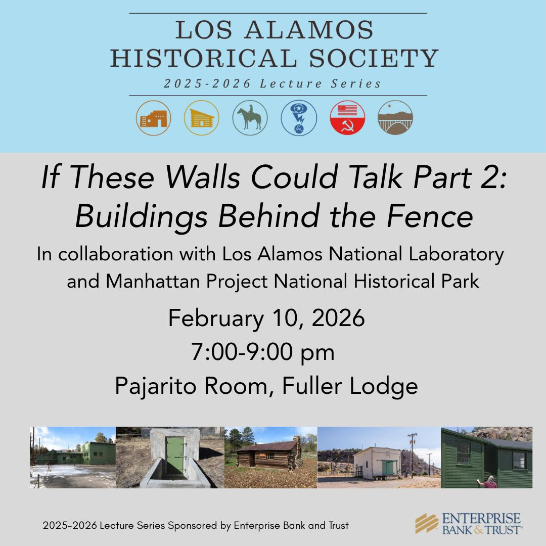 The Los Alamos Historical Society is pleased to invite you to the next lecture in the 2025–2026 Lecture Series, If These Walls Could Talk Part 2: Buildings Behind the Fence, presented in collaboration with Los Alamos National Laboratory and Manhattan Project National Historical Park.