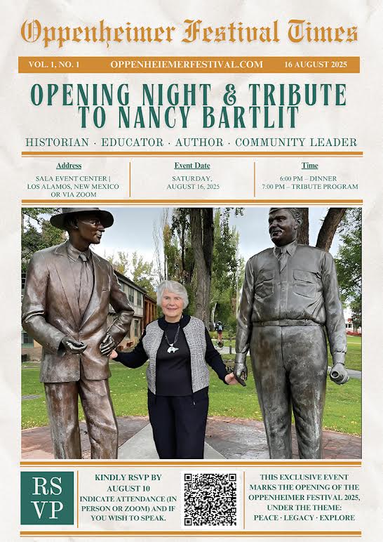 On Saturday, Aug. 16, 2025, the Oppenheimer Festival will open with a very special evening—an Opening Dinner and Tribute to Nancy R. Bartlit, one of Los Alamos’ most influential historians, civic leaders, and storytellers.