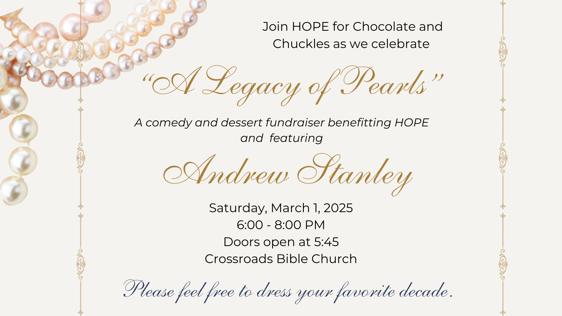 Get ready for a night filled with laughter and indulgence as HOPE Pregnancy Center proudly presents our 6th annual Chocolate and Chuckles with doors opening at 5:45 p.m., March 1, 2025, at Crossroads Bible Church.