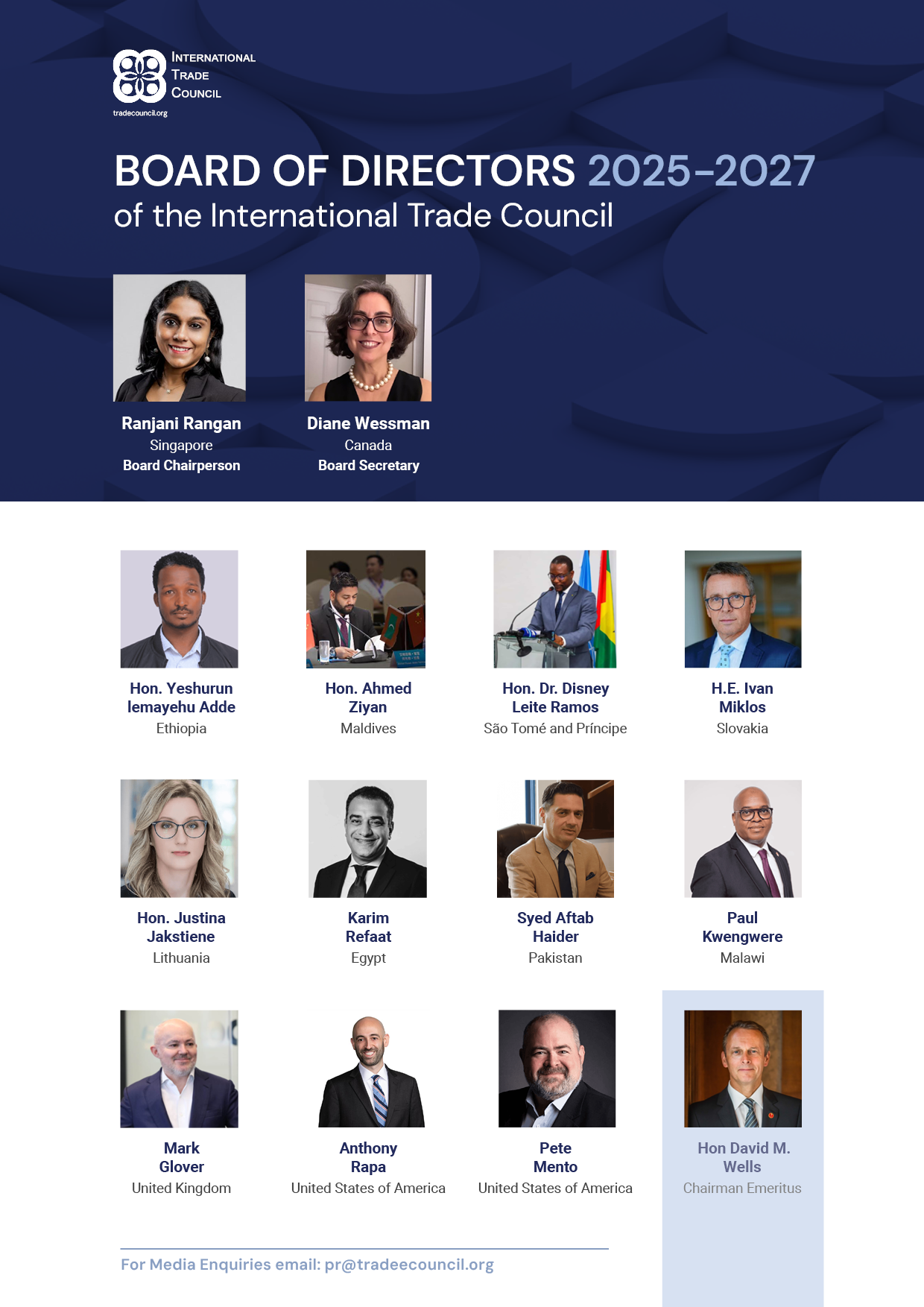 International Trade Council (ITC), a leading global chamber of commerce representing 28,000+ corporations across 179 countries, is proud to announce the election of 12 new members to its Board of Directors. These newly elected leaders will serve for an initial term beginning Jan. 15 2025 through Dec. 1 2027, bringing invaluable expertise to further ITC’s mission of fostering foreign market entry, reducing technical barriers to trade, and enhancing international trade education.