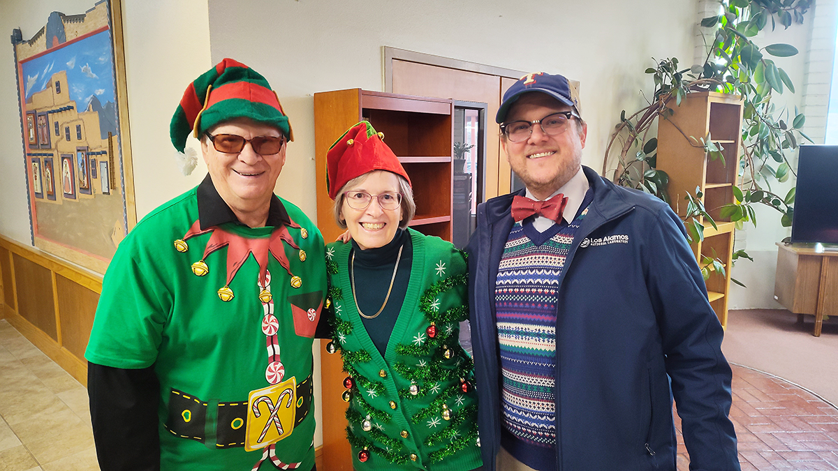 Lads and Lasses of Enchantment members John Deloff, Denise Pelowitz and Mark Willmon prepare for an upcoming performance. The Lads and Lasses of Enchantment and the Santa Fe Harmonizers have performed several singouts this week. On Monday, they sang at the MEG Senior Center in Santa Fe, and on Thursday night, for residents at the Los Alamos Wellness and Rehabilitation and Los Alamos Assisted Living Community. This Saturday, to benefit local nonprofit Self Help, Inc., they will sing and ring the Red Kettle Bell, from 2-4 p.m., at Smith’s Marketplace in Los Alamos. Photo by Bernadette Lauritzen