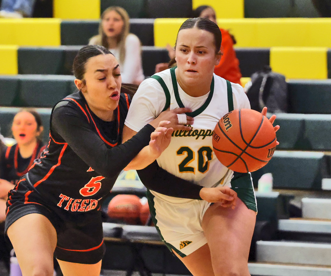 The Topper defense was strong as Javaya Davison and Danae Rodriguez covered Nevaeh Garcia under the Taos Tigers’ basket. Photo by John McHale/ladailypost.com