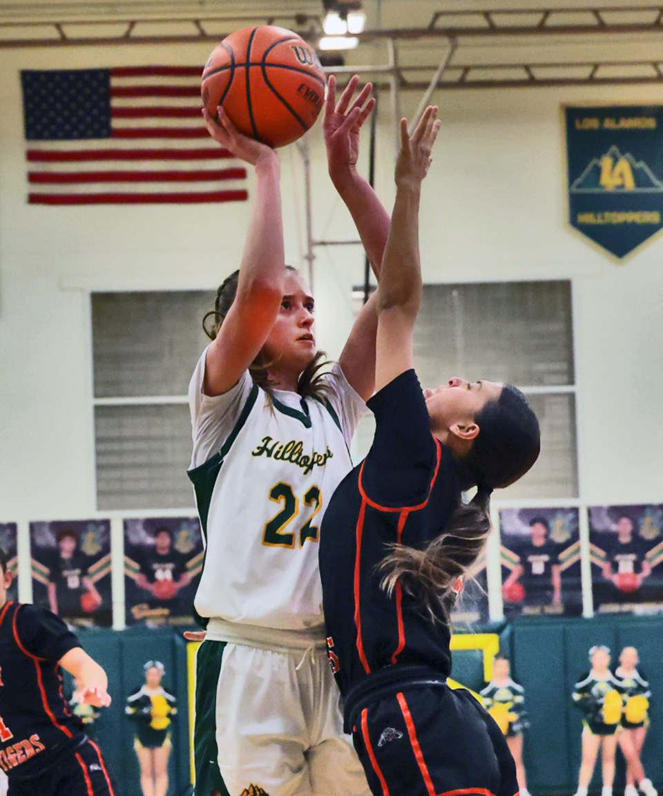The Los Alamos High School Lady Hilltoppers hosted the Lady Tigers from Taos in a conference game Thursday night in Griffith Gymnasium. The teams were well-matched so the lead changed hands several times and resulted in a low-scoring game due to strong defense by both teams. The Toppers improved their shooting in the second half to and pulled away to win the contest 39-24. The hero of the game was Javaya Davison because she not only dominated the rebounds at both ends of the court, but she also scored 22 points, making her the high-scoring player of the game. The Toppers are standing at 12-11 in district and 24-29 overall. Their next outing is Saturday, March 12, for a district game against the Pojoaque Elkettes; game time is 2 p.m. in the Ben Lujan Gymnasium in Pojoaque. Photo by John McHale/ladailypost.com