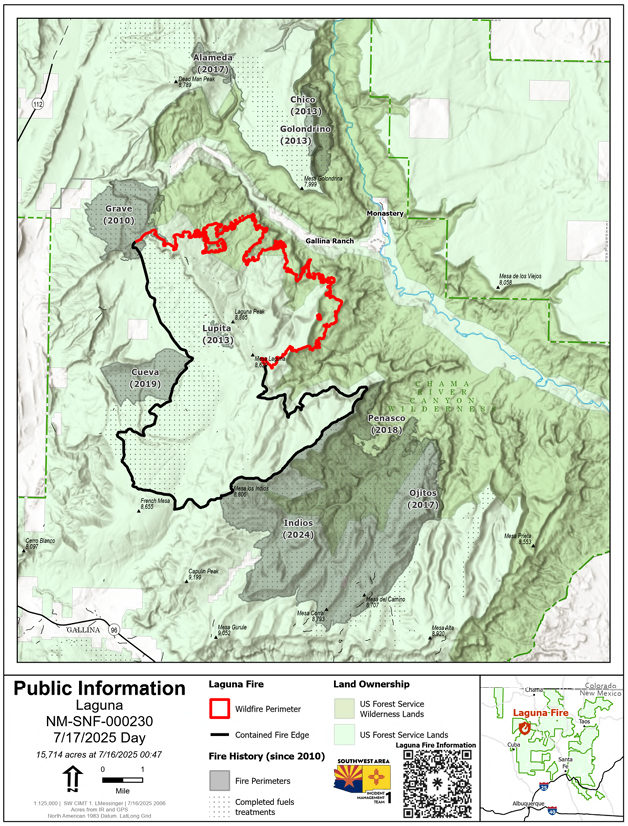 Closures, Flight Restrictions and Evacuations: A closure order is in place for USFS lands in the area. To view the complete order, visit www.fs.usda.gov/r03/santafe/alerts/laguna-wildfire-closure-order. For current TFR maps, visit tfr.faa.gov/tfr3/?page=list Gallina Ranch remains in GO evacuation status, and the Monastery of Christ in the Desert remains in SET status. For complete information on evacuations in New Mexico, visit www.emnrd.nm.gov/sfd/fire-prevention-programs/ready-set-go-new-mexico/.