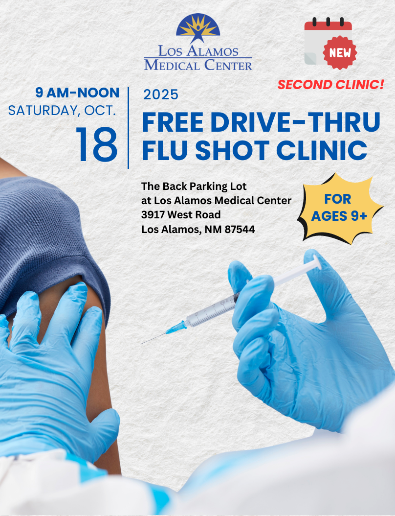 To meet demand and the healthcare needs of our community, Los Alamos Medical Center is proud to announce that it will host its second free drive-thru community flu shot clinic of the season from 9 a.m. to noon, Saturday, Oct. 18 in the hospital parking lot at 3917 West Road in Los Alamos. The hospital’s first flu shot clinic Sept. 27 vaccinated more than 400 individuals in our community.