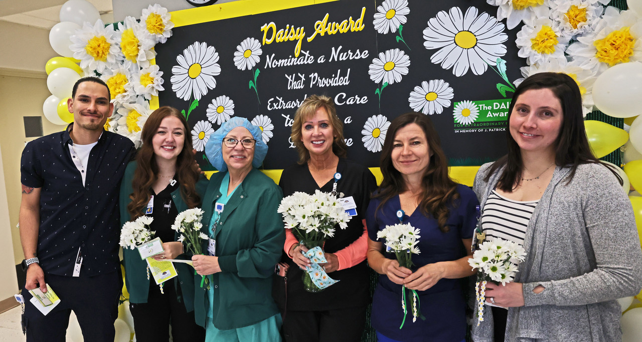 Los Alamos Medical Center’s 2025 Daisy Award nominees from left, Jake Cassell RN Surgical Services; Maura Enriquez, RN, Surgical Services; Elizabeth Parton, RN, Surgical Services, honoree Kathy Semelsberger, RN, Charge Nurse, Edyta Bartoszek, RN, Med-Surg and Genevieve Fairchild, RN, Quality Department. Not Present, Therese Whitmer, RN, Surgical Services; Maya McMillan, RN, Med-Surg and Joanna Sanchez, RN, Med-Surg. Photo by John McHale/ladailypost.com