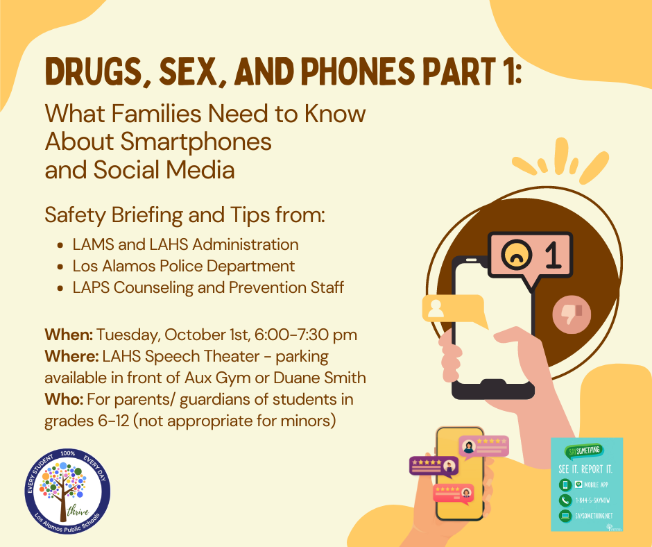 Los Alamos Public Schools (LAPS) invites parents and caregivers of students in grades 6-12 to attend a safety briefing: Drugs, Sex and Phones Part 1: What Families Need to Know About Smartphones and Social Media.