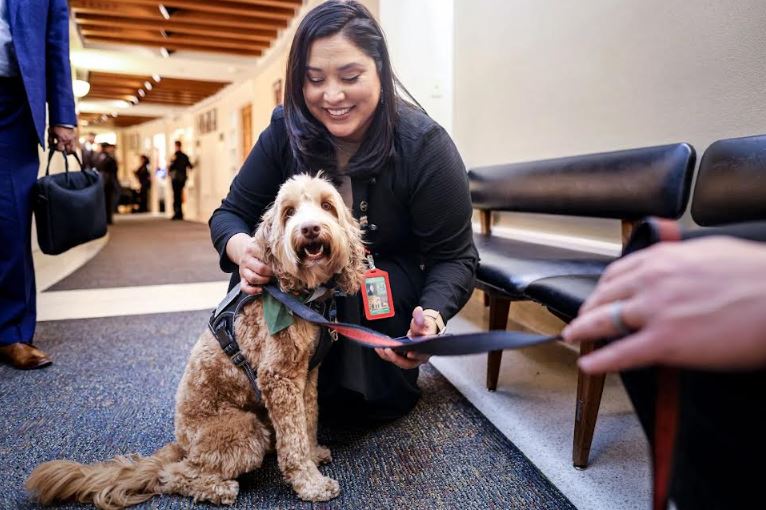 Rep. Michelle Paulene Abeyta, D-To’hajilee, kneels down to pet Oakley, an Albuquerque Police crisis dog who works with the Crisis Intervention Team who was touring the Capitol with Det. Josh Isler Tuesday, Feb. 25, 2025. Photo by Gabriela Campos/The New Mexican