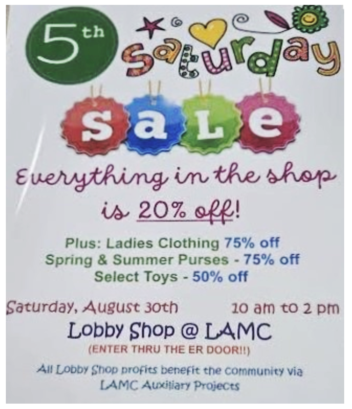 The Lobby Shop at Los Alamos Medical Center (LAMC) is hosting a 20 percent off sale, 10 a.m. to 2 p.m. on Saturday, Aug. 30.