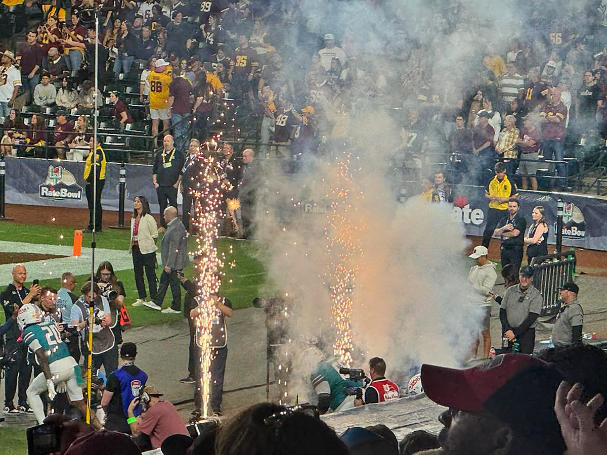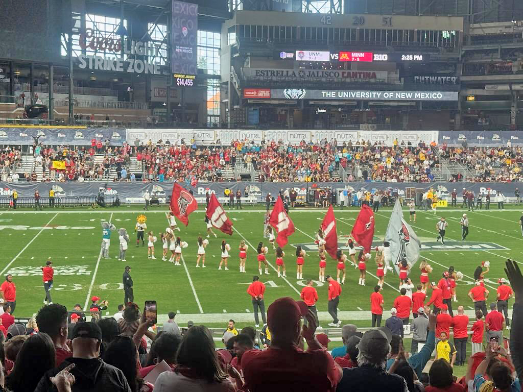 Lobos take the Field with 5 minutes to kick off against the Minnesota Golden Gophers today in the 2025 Rate Bowl at Chase Field in Phoenix. ‘Everyone’s a Lobo! Woof! Woof! Woof!’ Photo by Ryn Herrmann