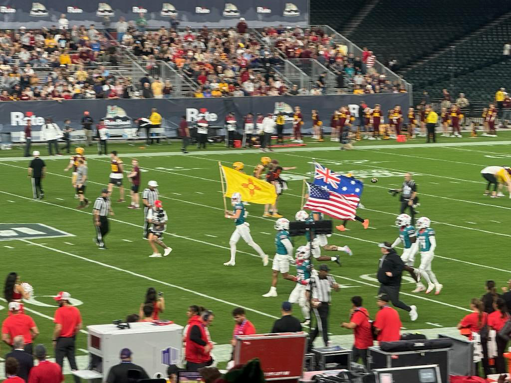 Another scene of Lobos taking the Field with 5 minutes to kick off against the Minnesota Golden Gophers today in the 2025 Rate Bowl at Chase Field in Phoenix. Photo by Ryn Herrmann