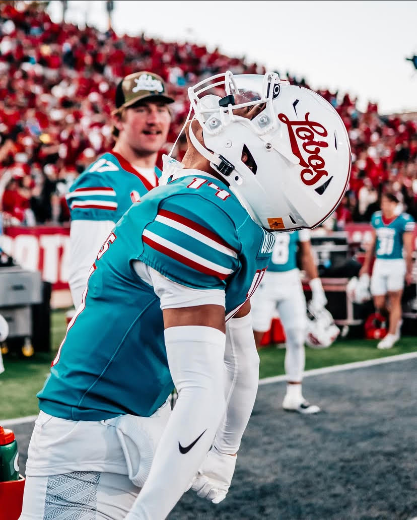 Melaki Gutierrez #14, Los Alamos High School class of 2024, celebrates after the Lobos football team won their final game, played Nov. 28, against San Diego. With the game going into overtime, the Lobos pulled through to win 23-17. Courtesy/Jordan Archuleta