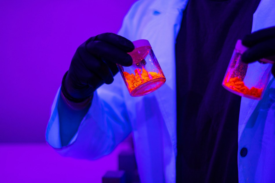 Quantum dot ink solution emitting an orange glow under ultraviolet excitation. Courtesy/UbiQD