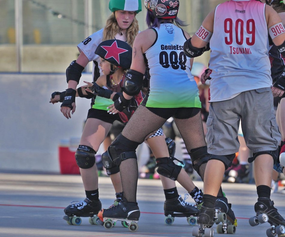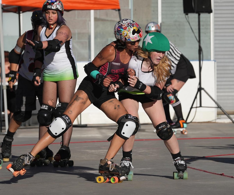 Cherry Bomb Blocker Wolverine blocks Jammer Frogmouth as she attempts to break free from the Cherry Bombs blockade in order to get into scoring position in the first match of the junior team. Photo by JohnMcHale/ladailypost.com