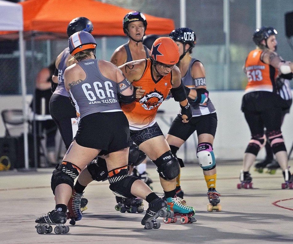 Jammer Star Foxy skates past the Fronterror blockade in the second adult match. Photo by John McHale/ladailypost.com