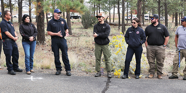 Los Alamos Fire Department Acting Wildland Division Chief Van Leimer talks about the project to visitors during a briefing Tuesday on Canyon Rim Trail. Photo by John McHaleladailypost.com