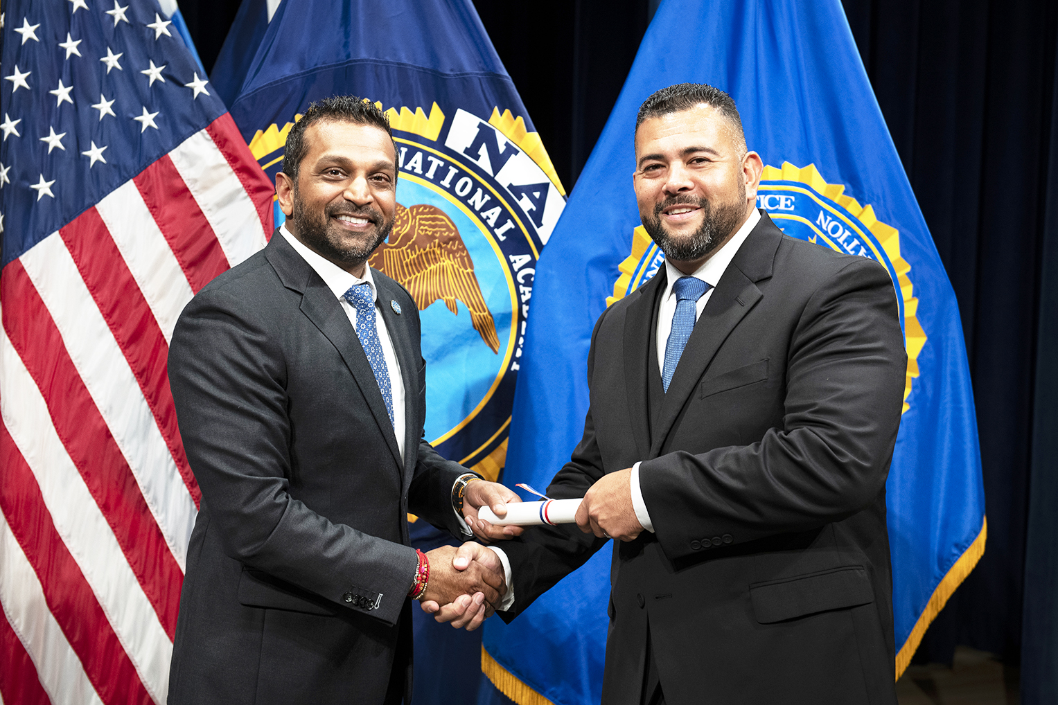 FBI Director Kash Patel, left, recognizes Los Alamos Police Chief James Rodriguez for competing the FBI National Academy. Courtesy/LAPD
