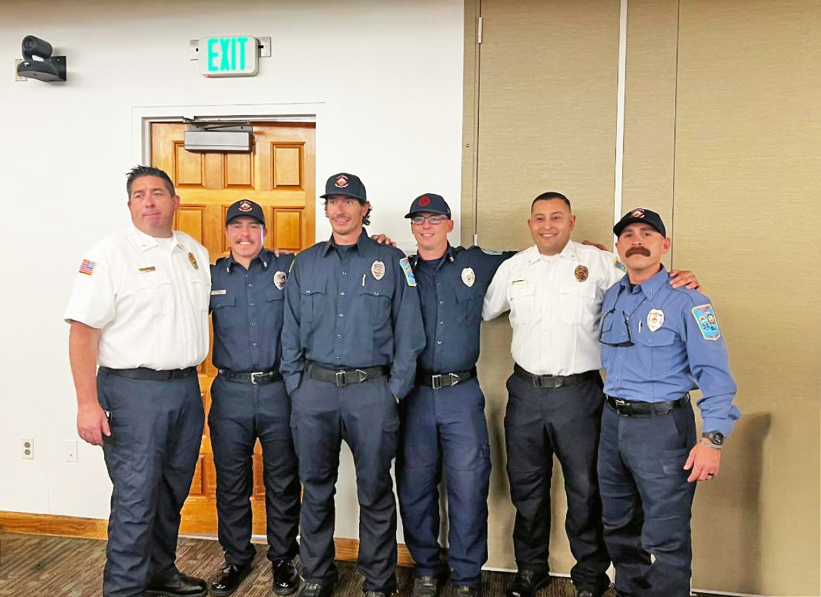 Los Alamos firefighters Nicholas Bever, Adrian Vigil, and Cory Miller, center, have graduated from Paramedic School at Santa Fe Community College. Their hard work, dedication, and commitment to advancing their skills make them important assets to the Los Alamos Fire Department and the community. Courtesy/LAC