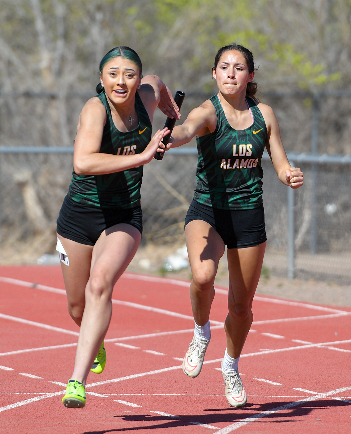 Jenna Montoya completes the handoff to Evangelina Gutierrez in the 4×100 m relay. With teammates Chloe Coffey and Allie Holland, they won this event in a state qualifying mark of 49.35 seconds. Photo by Blake Wood