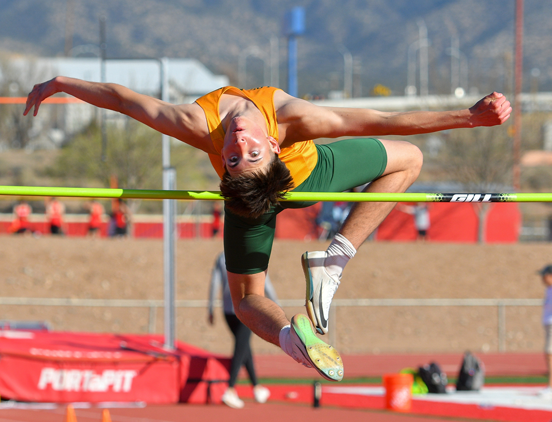 Patrick Montoya placed 3rd in the high jump, clearing 5′ 8″. Photo by Blake Wood