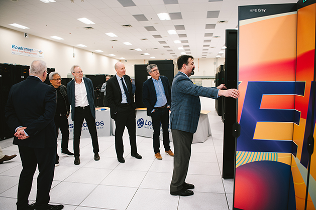 From left, Hewlett Packard CEO Antonio Neri, NVIDIA CEO Jensen Huang, LANL Interim Deputy Director for Science, Technology and Engineering Mark Chadwick, DOE Secretary David Turk, LANL Director Thom Mason, and LANL HPC Program Manager. Jim Lujan tour the supercomputing floor inside the Nicholas C. Metropolis Center for Modeling and Simulation during the ribbon cutting event Monday. Courtesy/LANL