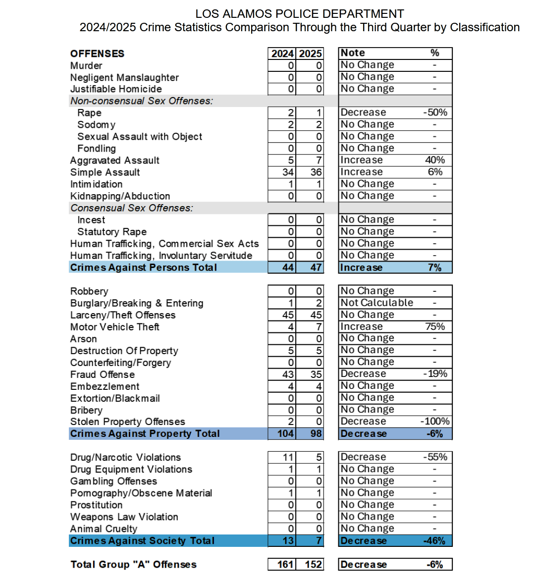 Today, Los Alamos Police Chief Dino Sgambellone released crime statistics through the third quarter of 2025, compiled by the Records Section of the Los Alamos Police Department.