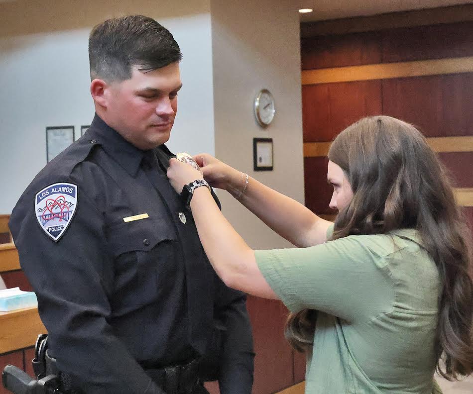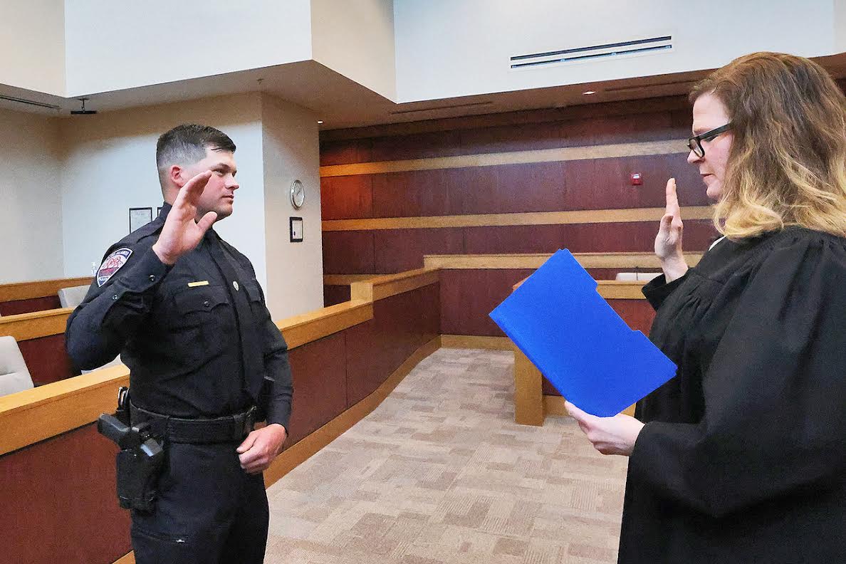 Jake Trujillo is sworn in as the community’s newest police officer Friday afternoon by the Honorable Judge Catherine Taylor during a ceremony in Los Alamos Magistrate Court. In New Mexico, new law enforcement officers take an oath to support the constitution and laws of the state of New Mexico, the constitution of the United States, and the ordinances of the municipality, and to faithfully perform the duties of the office upon which he or she is about to enter. Ofc. Trujillo is now a member of the Los Alamos Police Department, which year after year maintains prestigious accreditation through the Commission on Accreditation for Law Enforcement Agencies, Inc. (CALEA®), the Gold Standard in Public Safety. Photo by John McHale/ladailypost.com