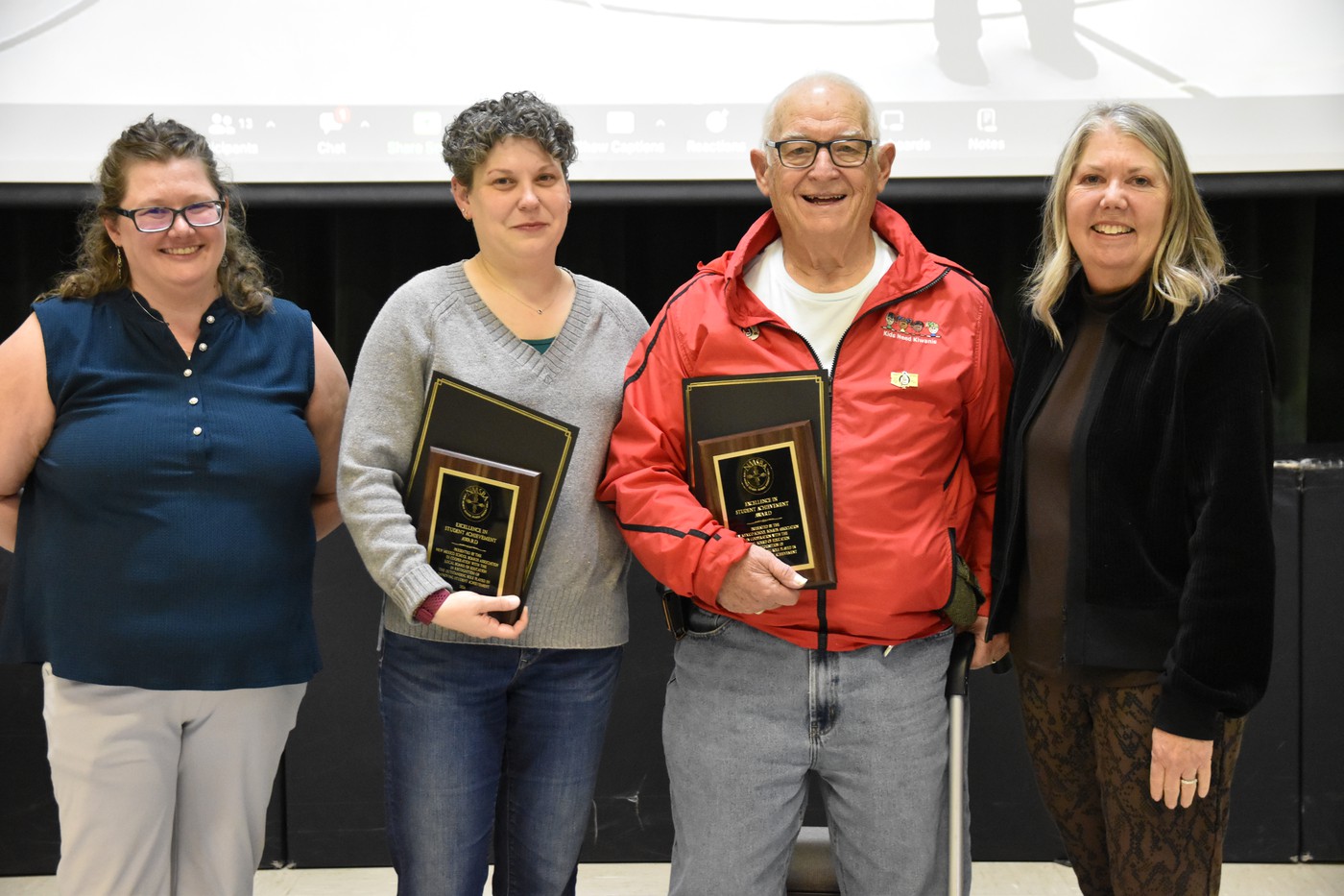 Los Alamos Middle School teacher Ali Semanision, second from left, and community member Morrie Pongratz along with his wife Cheryl (not pictured) received the 2024 NMSBA Excellence in Student Achievement awards during last month’s School Board meeting. Making the presentations were School Board member Lauren Coupland, left, and School Board Secretary Sondra Wyman. Courtesy/LAPS