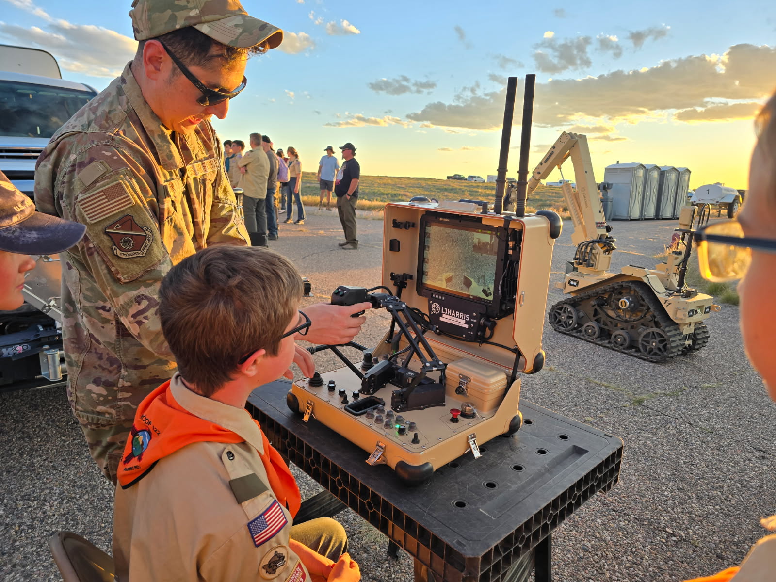 Scout Christopher Delgado takes instruction from Kirtland Air Force personnel to control a bomb disposal robot. Courtesy photo