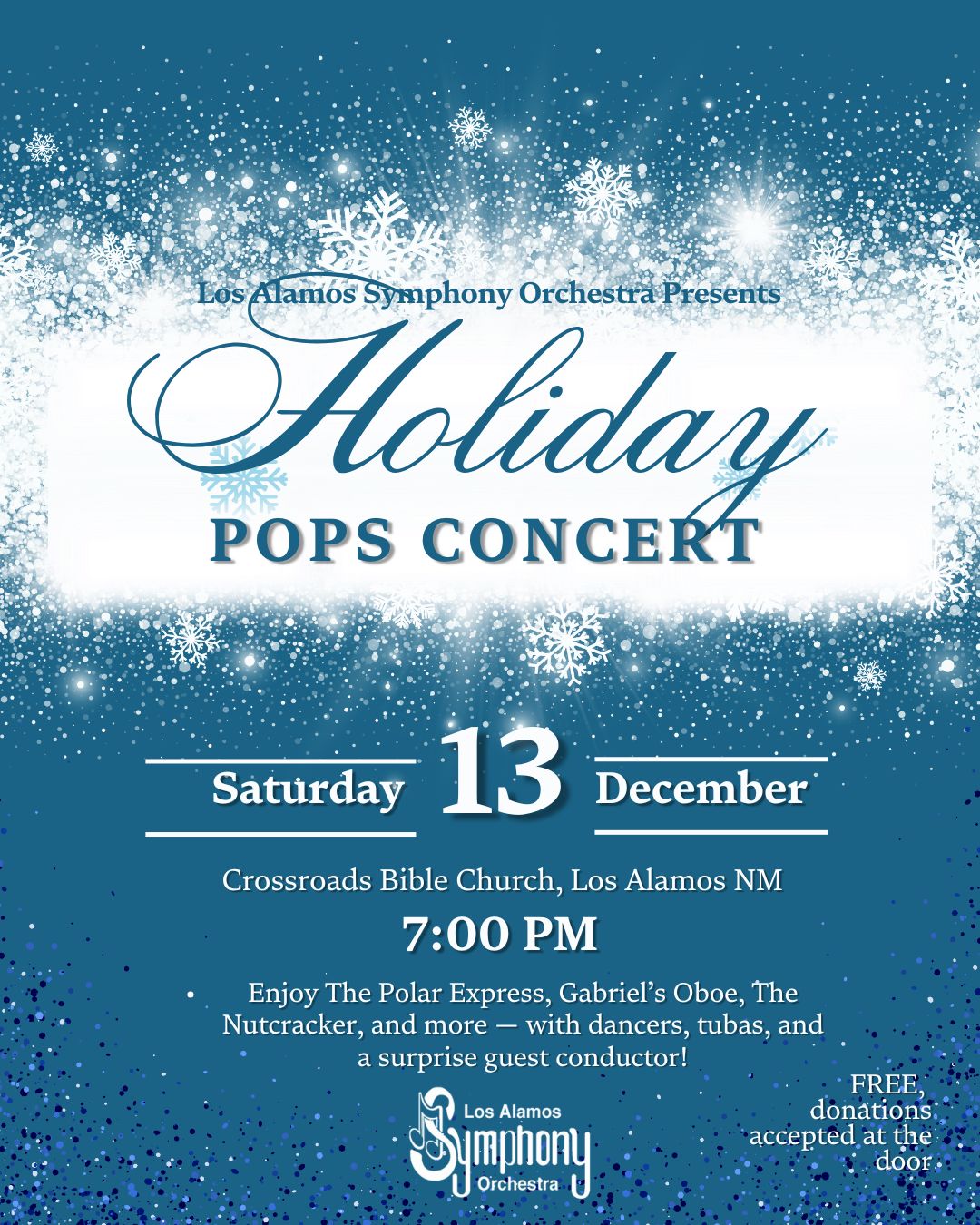 The Los Alamos Symphony Orchestra (LASO) invites the community to kick off the holiday season with its annual Holiday Pops Concert at 7 p.m., Friday, Dec. 13 at Crossroads Bible Church. This beloved free community event promises festive favorites, family-friendly surprises, and a joyful night of music.