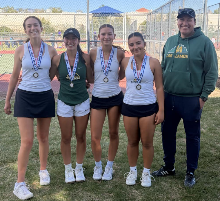 The Los Alamos High School tennis team advanced to the finals round of the district tournament this weekend with the boys finishing first and girls second in the group stage. The Los Alamos boys’ team won every match over the weekend with 9-0 wins over both Espanola Valley HS and Taos HS without dropping a set. The Los Alamos girls team beat Taos 9-0, but fell to a very strong EVHS team 8-1.