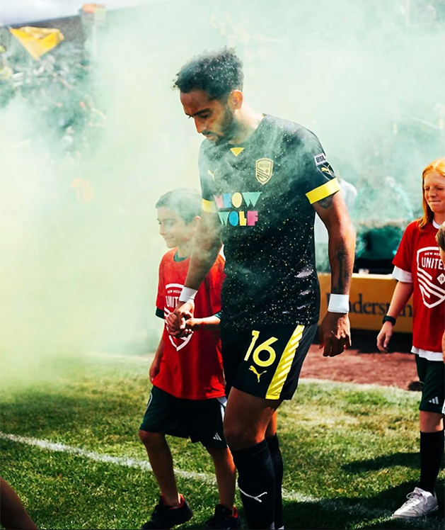 NM United with their LAYSL escorts on the field awaiting the performance of the Anthem. The players were respectful and included the children in every aspect of the process. Courtesy/LAYSL
