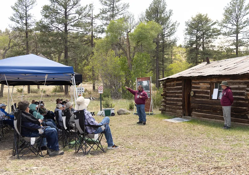 The park is surrounded by present-day Laboratory property in active use and includes the Pond Cabin (above), the last remaining structure of a dude ranch from an earlier era. Tour guide Elliot Schultz details how Manhattan Project scientists camped out while doing their calculations. Courtesy/LANL