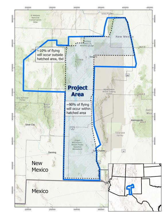 The flights will be based out of Belen (KBRG), Socorro (KONM), Truth or Consequences (KTCS), and Las Cruces (KLRU) airports. The flights could shift with little warning to other parts of the survey area as necessitated by flying conditions.
