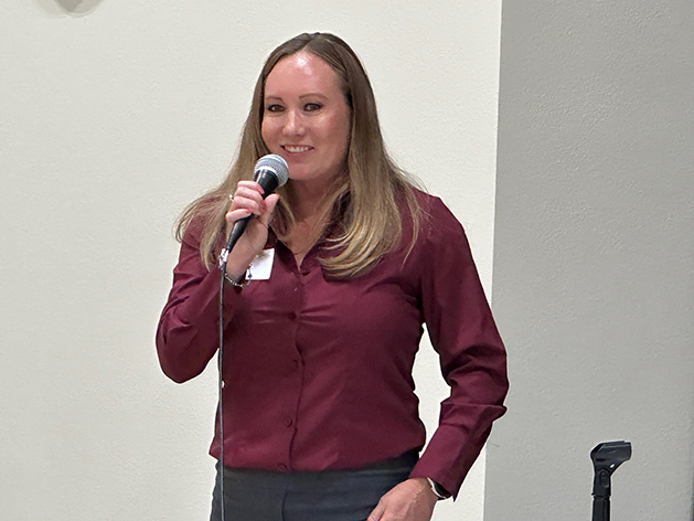 School Board District 1 Candidate Stephanie Galvez makes her opening statement at the League of Women Voters Candidates Forum Monday at Pinon Elementary School. Photo by Kirsten Laskey/ladailypost.com