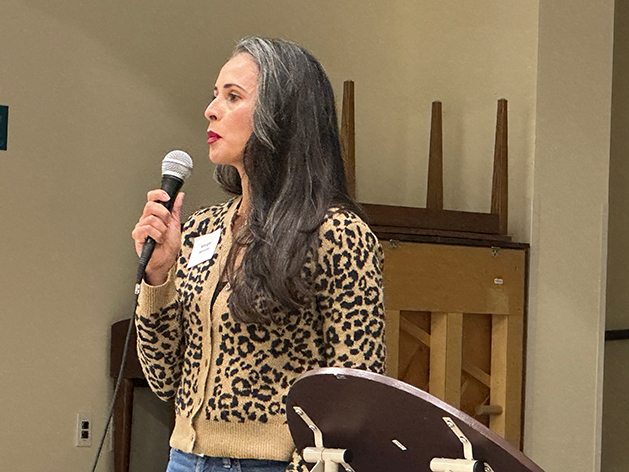 School Board District 1 Candidate Margie Serrato makes her opening statement at the League of Women Voters Candidates Forum Monday at Pinon Elementary School. Photo by Kirsten Laskey/ladailypost.com