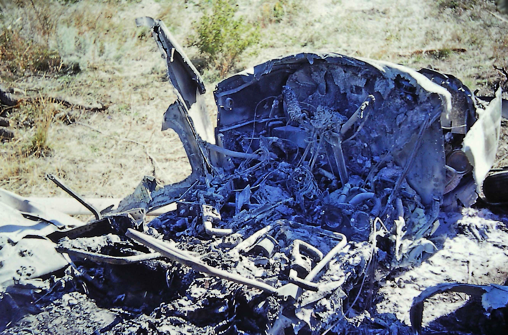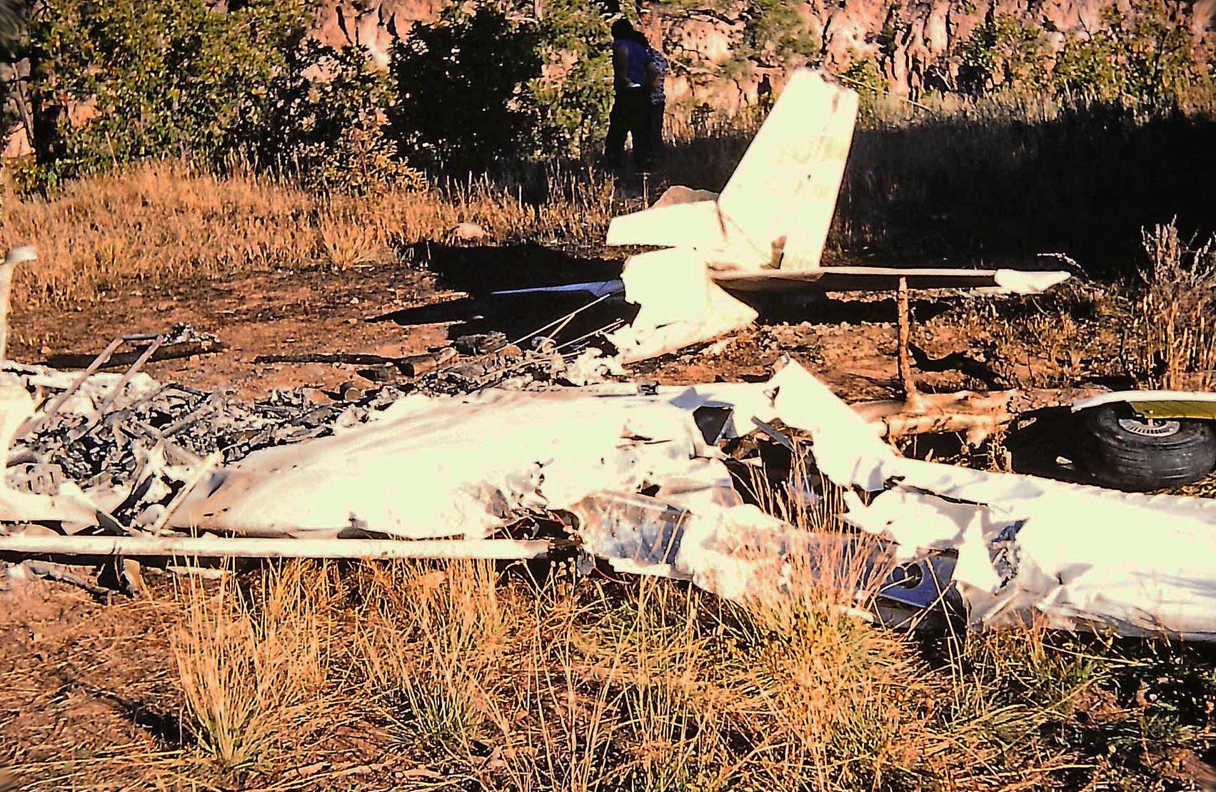 Scene of wreckage Oct. 12, 1975, the day following the plane crash at Los Alamos County Airport. Passenger Tim Farmer dragged pilot Dick Malenfant unconscious from the plane saving his life. Now 91, Malenfant lives in Highlands Ranch, Colo., and no longer flies. Photo by Bill Geer